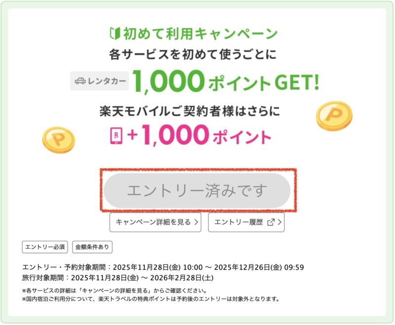 「楽天トラベルスーパーセール」では、事前エントリーが必須です。