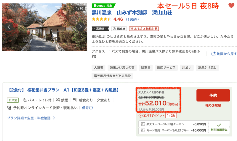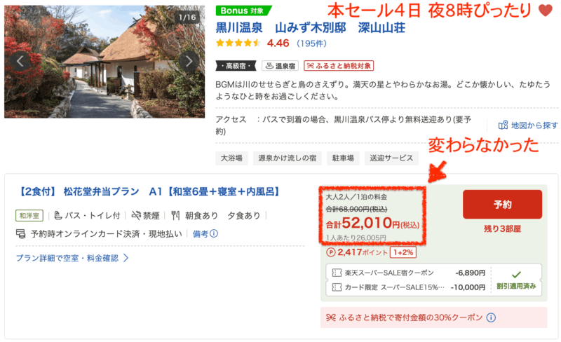 夜10時に楽天トラベルスーパーセールの画面を下まで見たら「半額以下のSALEプラン」出てきた!
