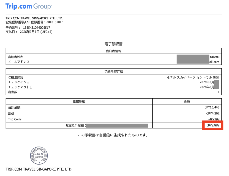 今回は、Trip.com予約で宿泊料金(1泊2人)は8,888円でした。