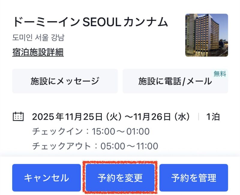 Trip.comアプリや公式サイトでホテル予約を確認すると、「キャンセル」の横に「予約の変更」があります。