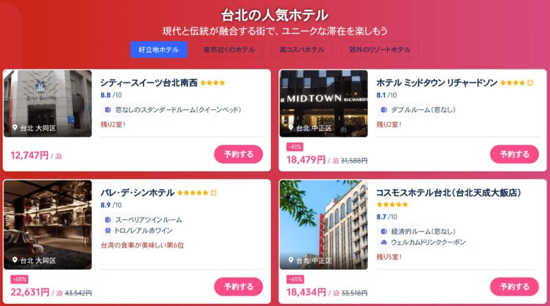 今すぐ台湾旅! | 10月20日〜10月26日まで | ホテルが最大50%OFF 航空券+ホテルが最大30%OFF お得なクーポン発行中 |