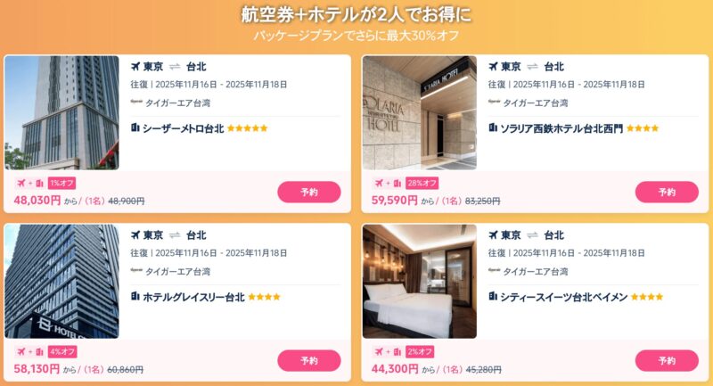あと、航空券+ホテルのパッケージプランが最大30%OFFです。